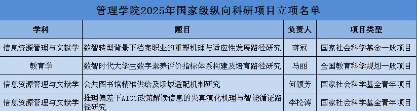 近日,全国哲学社会科学工作办公室和全国教育科学规划领导小组办公室陆续公布了2025年度评审结果。我院创历史最好成绩,共立项4项国家级纵向科研项目,其中国家社会科学基金年度项目3项,全国教育科学规划年度项目1项。具体信息如下: