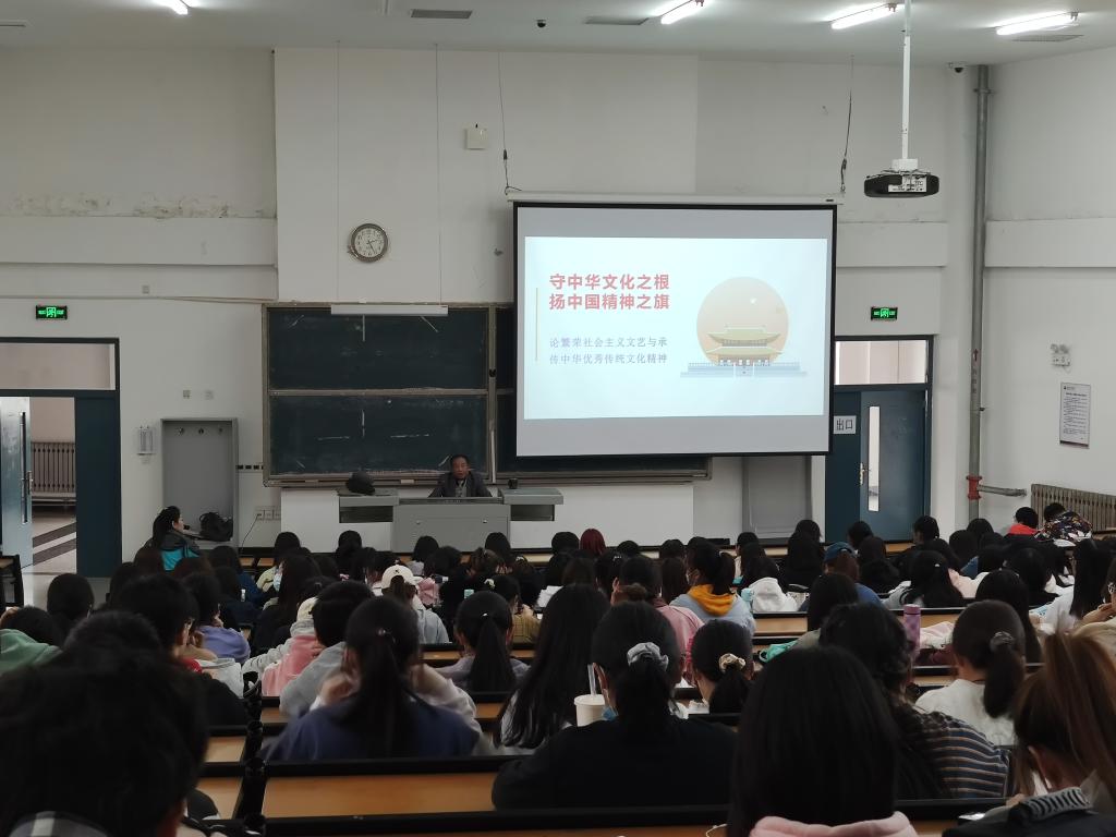 李老师从“诗言志”——对艺术情感特质和主观表现功能的重视、“仁义之人,其言蔼如”——对创作主体心性修养的强调、“兴观群怨”——对文艺反映现实和教化功能的关注以及“风清骨峻”——对阳刚之美艺术风格的提倡四个方面展开讲述。他结合具体实例,引经据典,以生动鲜活的案例、幽默风趣的语言深入浅出地解读了传统文化的当代价值,其中不乏对一些文艺作品的深刻解读。他强调,中华优秀传统文化的核心精神正是当代繁荣发展社会主义文艺必须认真研究和遵循的民族心理定势和审美理想规范。提倡广大青年学生“感物、读书”以“养气”,致敬经典,从人类艺术宝库中汲取营养,不忘初心,做有情怀、有志向、有温度的人。