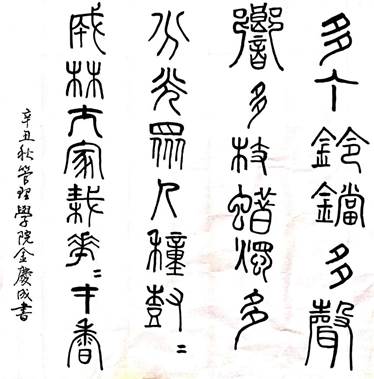 此幅作品是用篆书写就,释文如下:多个铃铛多声响,多枝蜡烛多分光。众人种树树成林,大家栽花花才香。另外,两个相同的字相连的地方,第二个字均打两点以表示之,这在书法作品中已成惯例,文中的“树”、“花”就是这种情况。