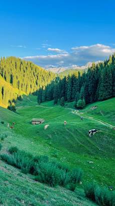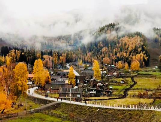 禾木村是新疆维吾尔自治区布尔津县下辖的一座村庄。位于新疆布尔津县喀纳斯湖畔,是图瓦人的集中生活居住地。禾木村的房子全是原木搭成的,充满了原始的味道。秋日的清晨,禾木村雾气蒙蒙,配上金色的树木与可爱小木屋构成了独特的自然与文化景观。那一条白色小路,弯弯曲曲地通向雾蒙蒙的森林深处。整个画面宁静安逸,仿佛仙境一般。