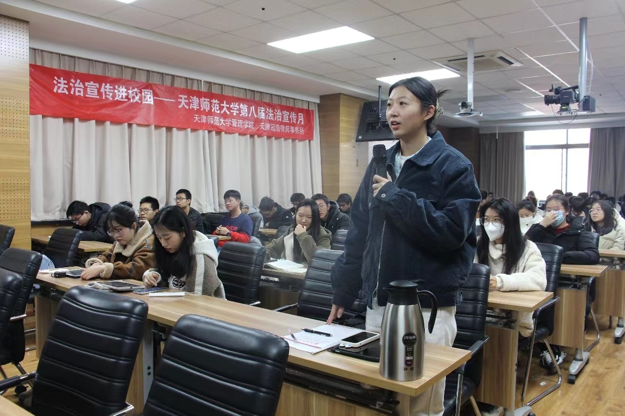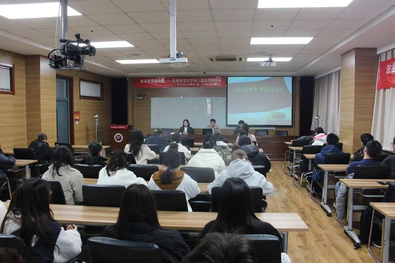 为深入学习贯彻习近平法治思想,进一步加强法治宣传教育,营造学法、遵法、讲法的良好氛围,在我国第十个宪法日来临之际,结合我校开展的第八届法制宣传月活动,英国365上市集团于12月4日在兴文楼A219举办了法治宣传进校园活动。活动邀请到天津冠浩律师事务所韩松、赵薇、刘东洋三位律师到校,开展法治宣传讲座和法律咨询服务,70多名学生参与活动,活动由学工办主任刘鹏主持。