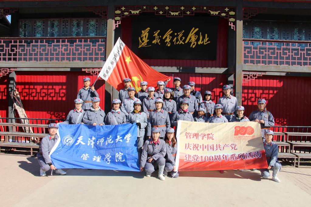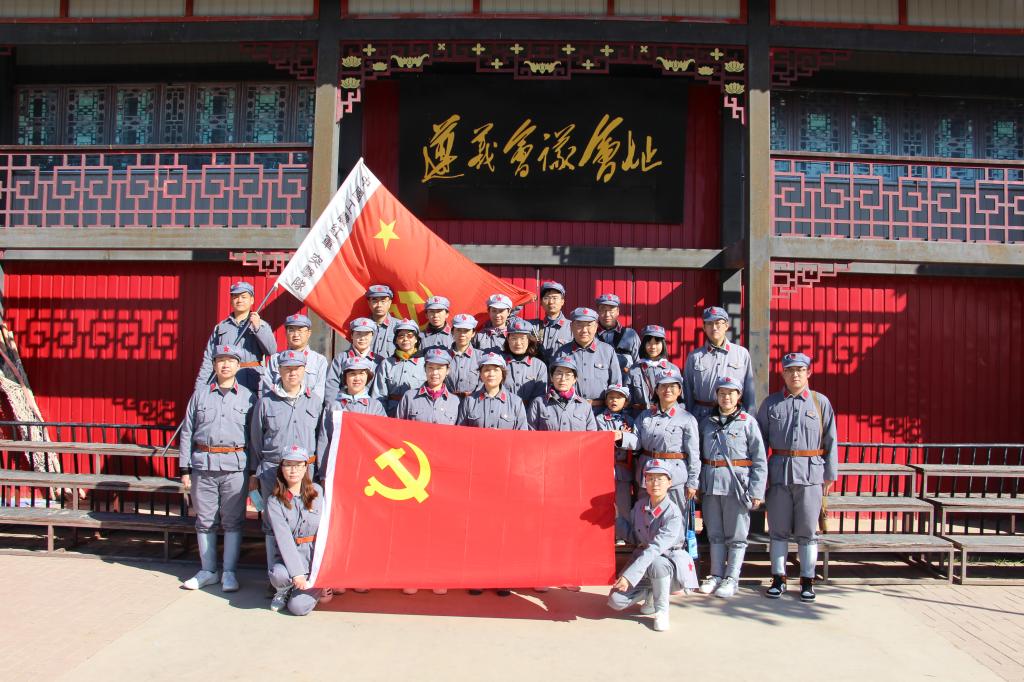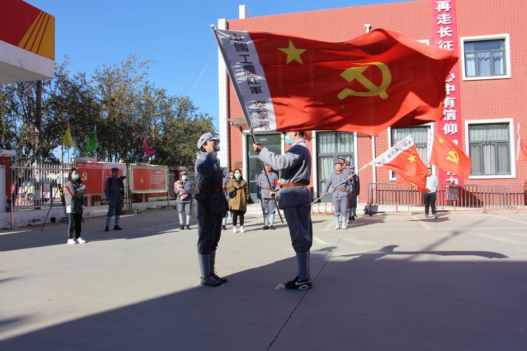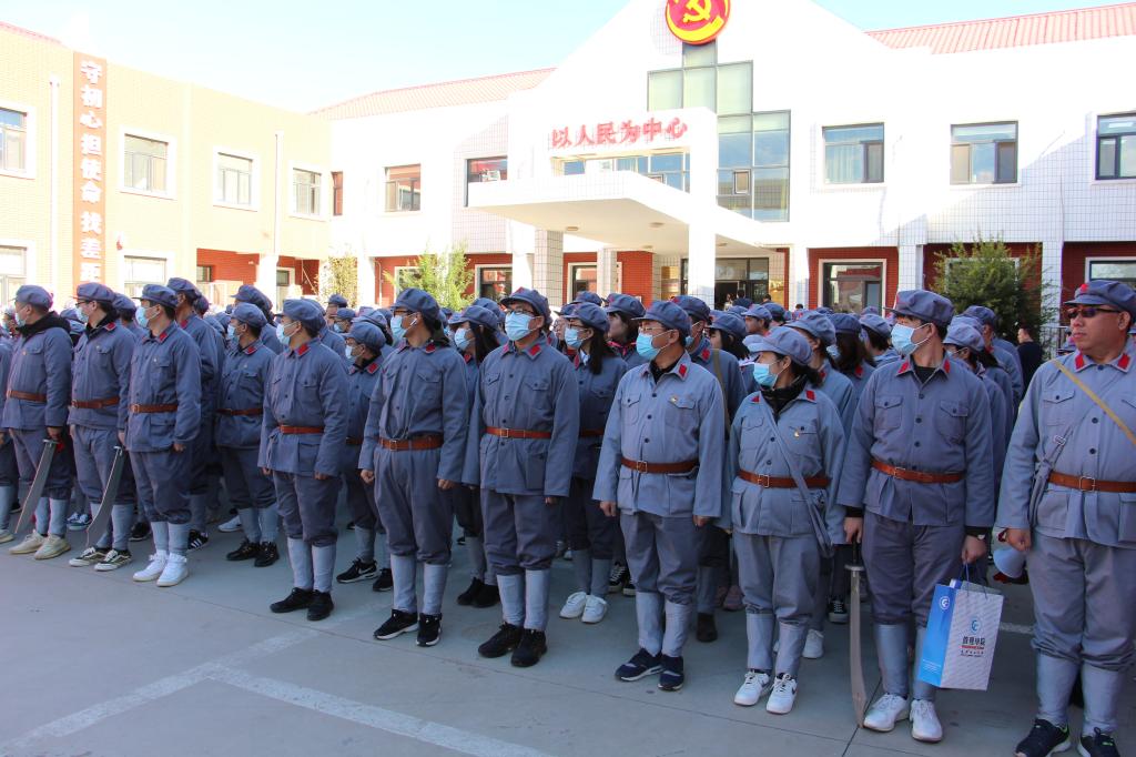 深秋清晨,天气寒冷,英国365上市集团三十余名老师在学校统一集结,奔赴西青区辛口镇第六埠村,大家身着红军军服,腰别武器,手擎红旗,个个精神饱满,斗志昂扬。全体指战员重温入党誓词后,学院党委书记张庆红老师向行军团郑重授旗,部队番号为“中国工农红军突击队”。