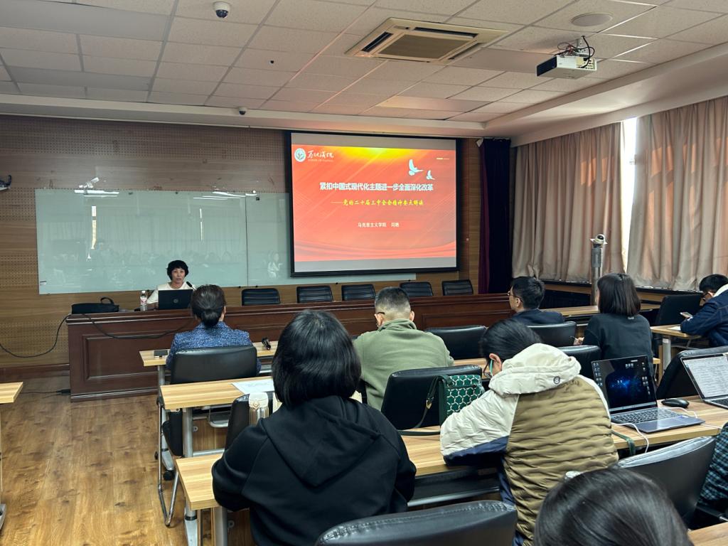 张庆红代表学院教师感谢闫艳教授的精彩报告。她指出:闫艳教授的报告旁征博引,事理结合,逻辑缜密,从改革的目标导向到问题导向,从“六个紧紧围绕”到“七个聚焦”,从强化理论武装到悟透精神实质,从深植为民情怀到崇尚求真务实,对党的二十届三中全会精神要点进行详细解读,实现理论高度、实践深度和思维广度的高度统一,体现了我校马克思主义学院教师深厚理论基础。她强调,全国教育大会精神是教育系统进一步全面深化改革的延伸,全体教师要把进一步加强学习,将党的二十届三中全会精神和全国教育大会精神学习成果转化为教育强国建设的生动实践。要聚焦立德树人根本任务,在日常教育教学、科学研究和服务经济社会发展中取得更大的成效,努力实现我院各项重点工作创新突破。