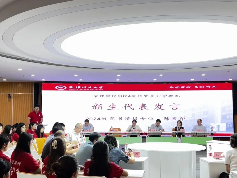 2023级情报学专业研究生曾雯和2024级图书情报专业研究生陈宝印分别作为在校生代表和新生代表发言。曾雯用“时间管理、团队协作、保持好奇心和享受旅途”为主要内容对研究生生活进行诠释,呼吁大家勇往直前,走好自己的学术之路。陈宝印同学对研究生生活进行了展望,以热情饱满的态度来迎接新的研究生生活。