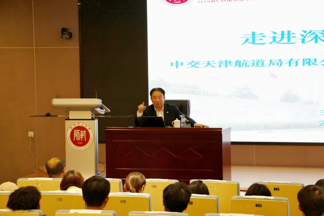 “大国工程背后,是建设者们以海为纸、以船为笔写下的奋斗诗行。”韩惠来以亲身经历为线,讲述了中交天航局参与国家远海工程的奋斗历程。他从深海航道的昼夜疏浚,到远海岛礁项目的攻坚克难,将中交天航人“敢闯深蓝、勇担使命”的工匠精神,融入一个个真实场景——台风中的设备检修、团队协作的不眠之夜、缺水少粮的煎熬以及海浪烈日的生死考验等等,让在座青年真切感受到“海洋强国”战略背后的不畏艰险、勇于奉献的精神,为青年学生带来了一堂浸润家国情怀的生动精彩一课。