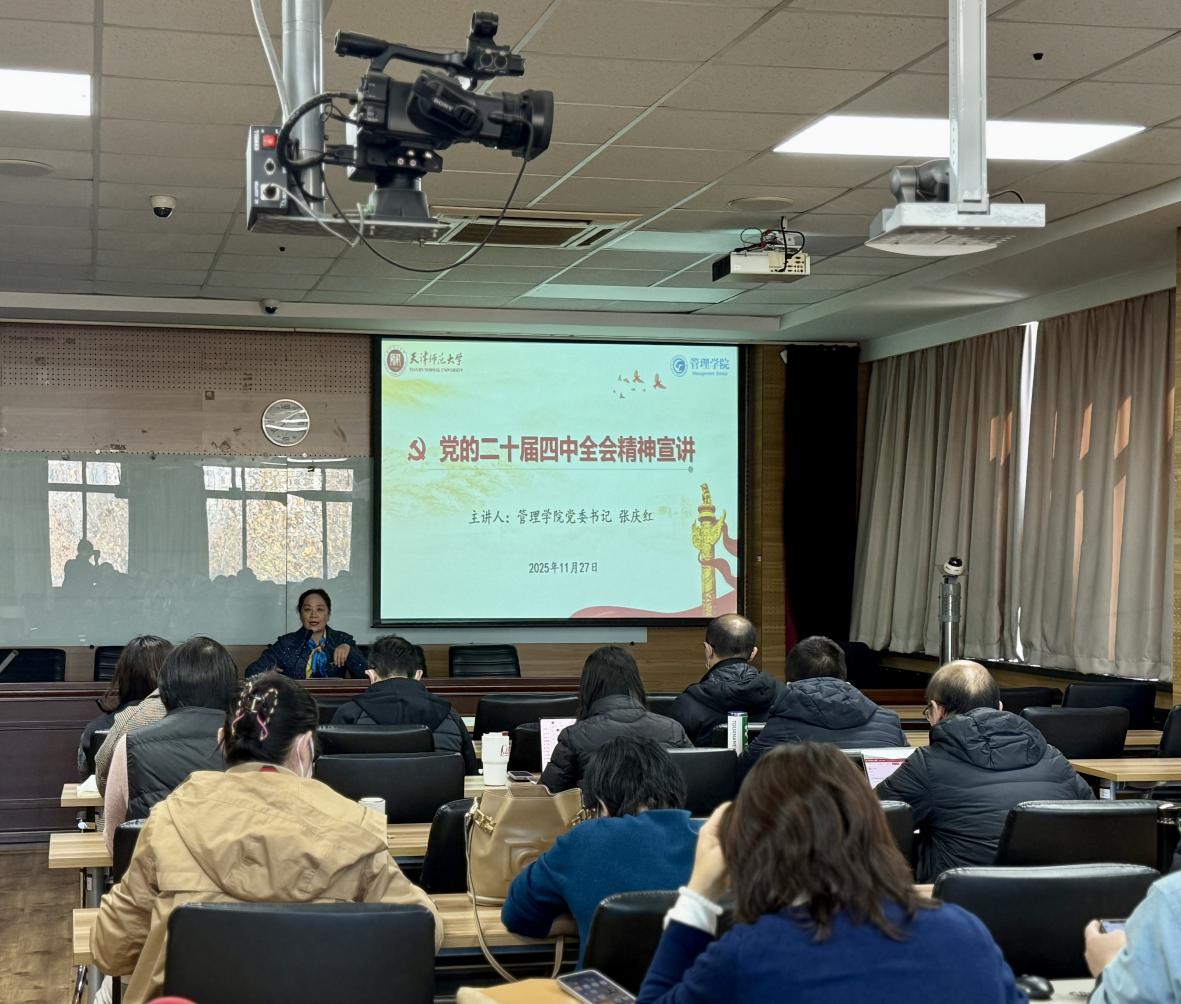 张庆红围绕习近平总书记在全会上的工作报告、关于《中共中央关于制定国民经济和社会发展第十五个五年规划的建议》的说明及全会通过的《中共中央关于制定国民经济和社会发展第十五个五年规划的建议》进行详细解读。她谈及回顾“十四五”时期重大成就时表示,我国经济总量稳步增长、2024年全社会研发经费投入突破3.6万亿元的背后,是管理效能的持续提升。人工智能等数智创新领域的突破,更需要“管理 + 科技”的深度融合,这正是学院的发力方向。